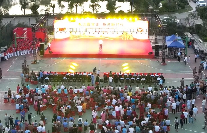 演出的最后,全體在場人員合唱《沒有共產(chǎn)黨就沒有新中國》,臺上燈火通明,臺下黨旗搖動,悠揚的歌聲飄蕩在鳳凰山下,久久不息。