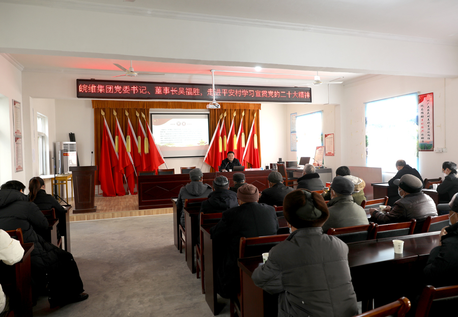 12月30日是2022年最后一個工作日,皖維集團公司黨委書記、董事長吳福勝不辭辛苦,從繁忙的事務(wù)中抽身,前往槐林鎮(zhèn)平安村,為平安村黨員宣講黨的二十大精神,調(diào)研全年鄉(xiāng)村振興工作。集團公司黨委副書記張正和,公司辦公室、黨委工作部負責(zé)人陪同。