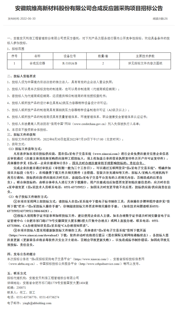 皖維高新材料股份有限公司合成反應(yīng)器采購項(xiàng)目招標(biāo)