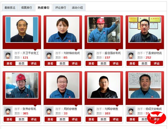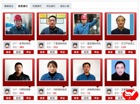 截止12月17日8:00時,評選活動歷時整整24小時,有機分廠張偉得票385,為16日的得票王;黨委工作部的齊衛(wèi)平人氣關(guān)注度1177,是16日的人氣王。兩項指標(biāo)的前8名見下圖。