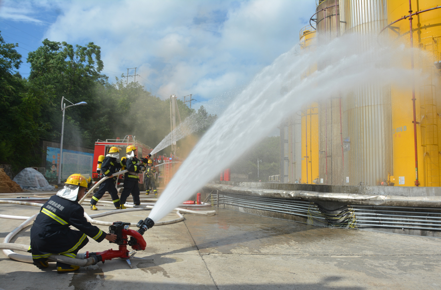 根據(jù)應(yīng)急預(yù)案響應(yīng),參演人員全力以赴,積極應(yīng)對險情;公司消防隊迅速出動,專職消防人員從架設(shè)水槍開展專業(yè)撲救,到身穿防化服進(jìn)入泄漏點進(jìn)行檢測和堵漏;環(huán)保人員對事故現(xiàn)場周圍大氣環(huán)境和事故污水進(jìn)行了收集和有效監(jiān)測,充分展示了有機(jī)分廠、保衛(wèi)處消防隊、生產(chǎn)安環(huán)部等相關(guān)單位的應(yīng)急處置能力,達(dá)到了練指揮、練技能、練協(xié)同、練戰(zhàn)法、練保障的效果。