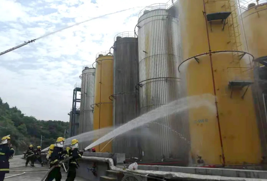 此次滅火救援應急拉練不提前通知、臨機設情、現(xiàn)場下達作戰(zhàn)任務,模擬有機分廠2#罐組CC-606B甲醇儲罐管道法蘭連接處發(fā)生泄漏著火時的狀況。演練開始,罐場工作人員接到報警,立即通知消防隊、分廠領導以及公司調度室等相關單位,并啟動分廠事故應急預案,現(xiàn)場工作人員采取關閥斷料、噴淋冷卻、人員疏散等緊急救援措施,分廠其他工段人員接到指令后攜帶滅火器、水帶、水槍趕赴現(xiàn)場增援,對初起火災進行了有效撲救和處置。公司專職消防隊接到報警,立刻出動四輛消防車進行緊急處置,以水力壓制控制火勢直到徹底撲滅。由于管道法蘭連接處物料仍在泄露,消防隊員當即身穿防化服進入泄漏點進行偵檢和堵漏,在分廠工作人員配合下堵漏成功。同時,環(huán)保人員還對事故現(xiàn)場周圍大氣環(huán)境和事故污水進行了收集和有效監(jiān)測,整個事故應急救援圓滿完成。