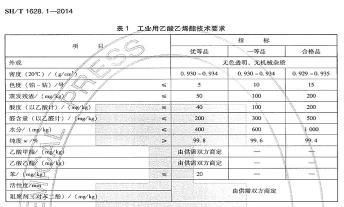 5、質(zhì)量標(biāo)準(zhǔn)及質(zhì)量要求:SH/T1628.1-2014《工業(yè)用乙酸乙烯酯》(中華人民共和國石油化工行業(yè)標(biāo)準(zhǔn))一等品,具體如下: