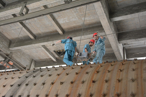 “高空作業(yè)”——圖為水泥分廠2#水泥磨上,工人們正在拆卸磨門(mén)